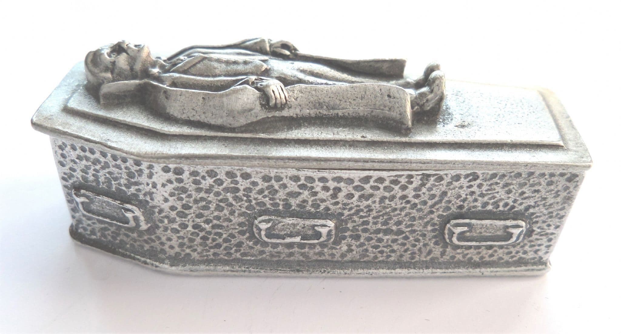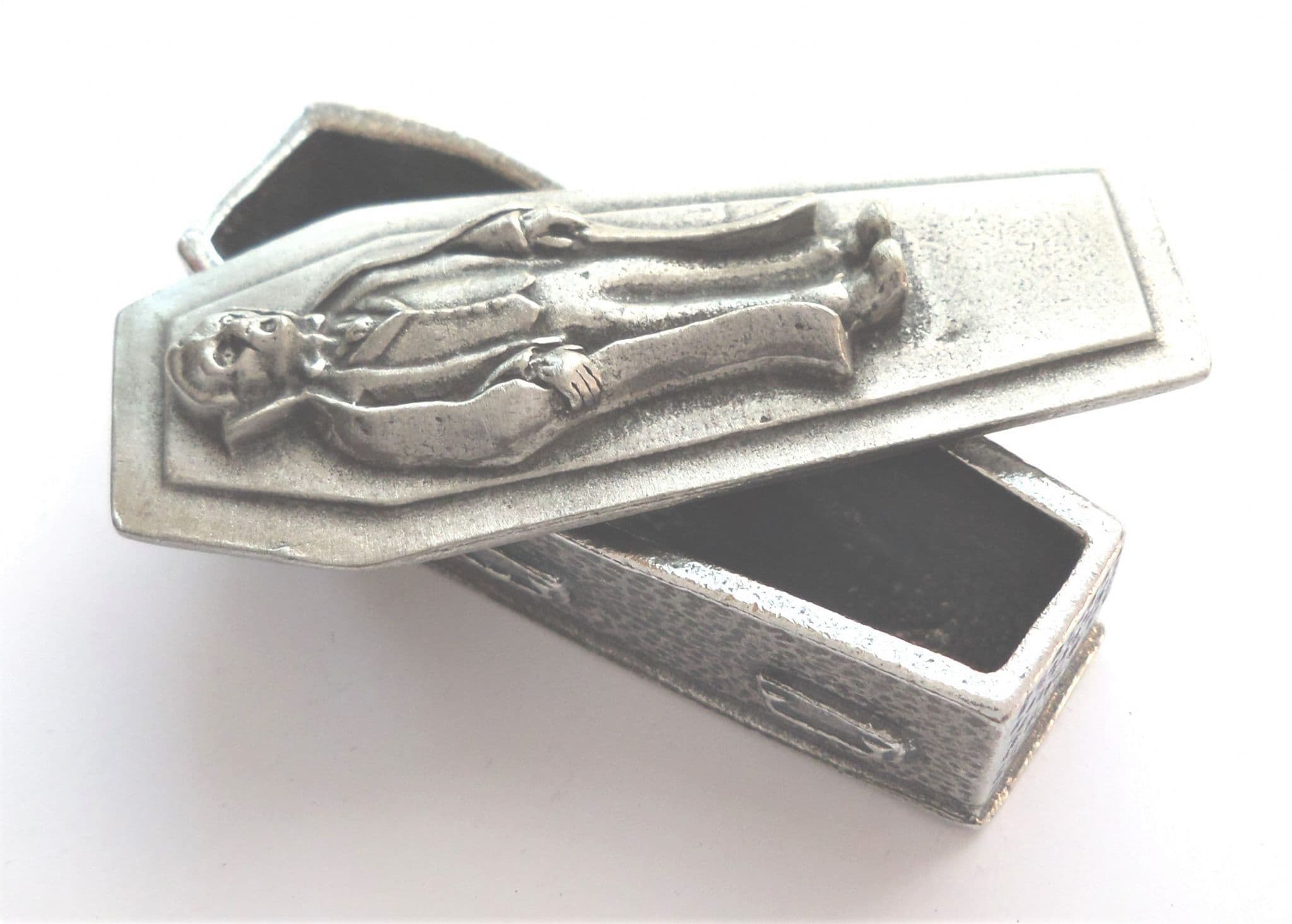 Solid Pewter – Small, but heavy. This trinket box, lid and figurine measures approximately:. Width – 2. 2cm; Depth – 6cm; Height – 2. 5cm. (Width – 0. 8 inches; Depth – 2. 3 inches; Height – 1 inch).. Our Hertfordshire Pewter trinket boxes are handmade. Molten pewter is poured into a hand crafted resin mold and spun at high speed to create the stunning details of each ornament. The product is then left to cool for 3 days, allowing the box to strengthen. The final piece is then buffed to ensure a wonderful sheen finish.. There is an option to include a small velvet-style gift pouch with the product – a perfect option to gift this pewter item to a friend of family member.
